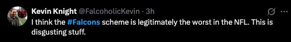 -In that MNF game vs the Bills, which now seems eons ago, Bijan Robinson went from 170 rushing yards that night to (checks notes) 25 today. That’s less than the 40 yards he got last week on SNF. Not his fault. Fault the person who’s supposed to draft new plays to keep opponents guessing Robinson’s moves. Who’s that? The other person on this team whose last name is “Robinson”.