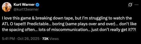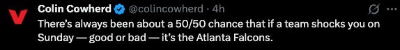 -In that MNF game vs the Bills, which now seems eons ago, Bijan Robinson went from 170 rushing yards that night to (checks notes) 25 today. That’s less than the 40 yards he got last week on SNF. Not his fault. Fault the person who’s supposed to draft new plays to keep opponents guessing Robinson’s moves. Who’s that? The other person on this team whose last name is “Robinson”.