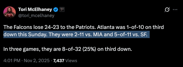 And here’s another one, from Falcons reporter Tori McElhaney. Notice the 3rd down conversion trend.