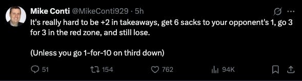 The Falcons just have not found a way to turn what are solid advantages (the presence of Penix Jr., London, Robinson, improved defense, a little-seen miracle for the Falcons called a pass-rush) into victories. They have lost to teams they have no business losing to (Panthers, Dolphins), and teams that they had opportunities to win against but did not take advantage (Buccaneers, 49ers, now Patriots). Playoff-worthy teams do not operate like this, and the Falcons’ playoff hopes (if they thought they had any) are sinking quickly.