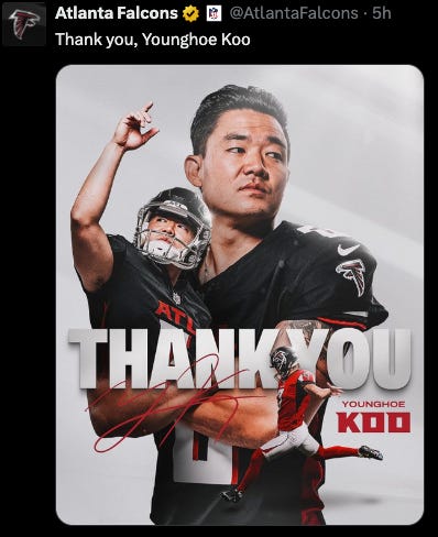 Koo’s five-year $24,250,000 contract was due to expire in 2027. The Dirty Birds will eat $1.25 million in dead money, but save $4.25 million towards the salary cap, according to OverTheCap.com.